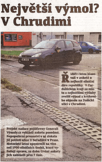 Nadace pojišťovny Generali Výmoly.cz vyhlásila anketu o největší silniční výtluk. V našem kraji vyhrál výmol kolem odvodňovacího systému vlečkového železničního přejezdu na křižovatce u lihovaru v Chrudimi – Dašická ulice III/34026.
