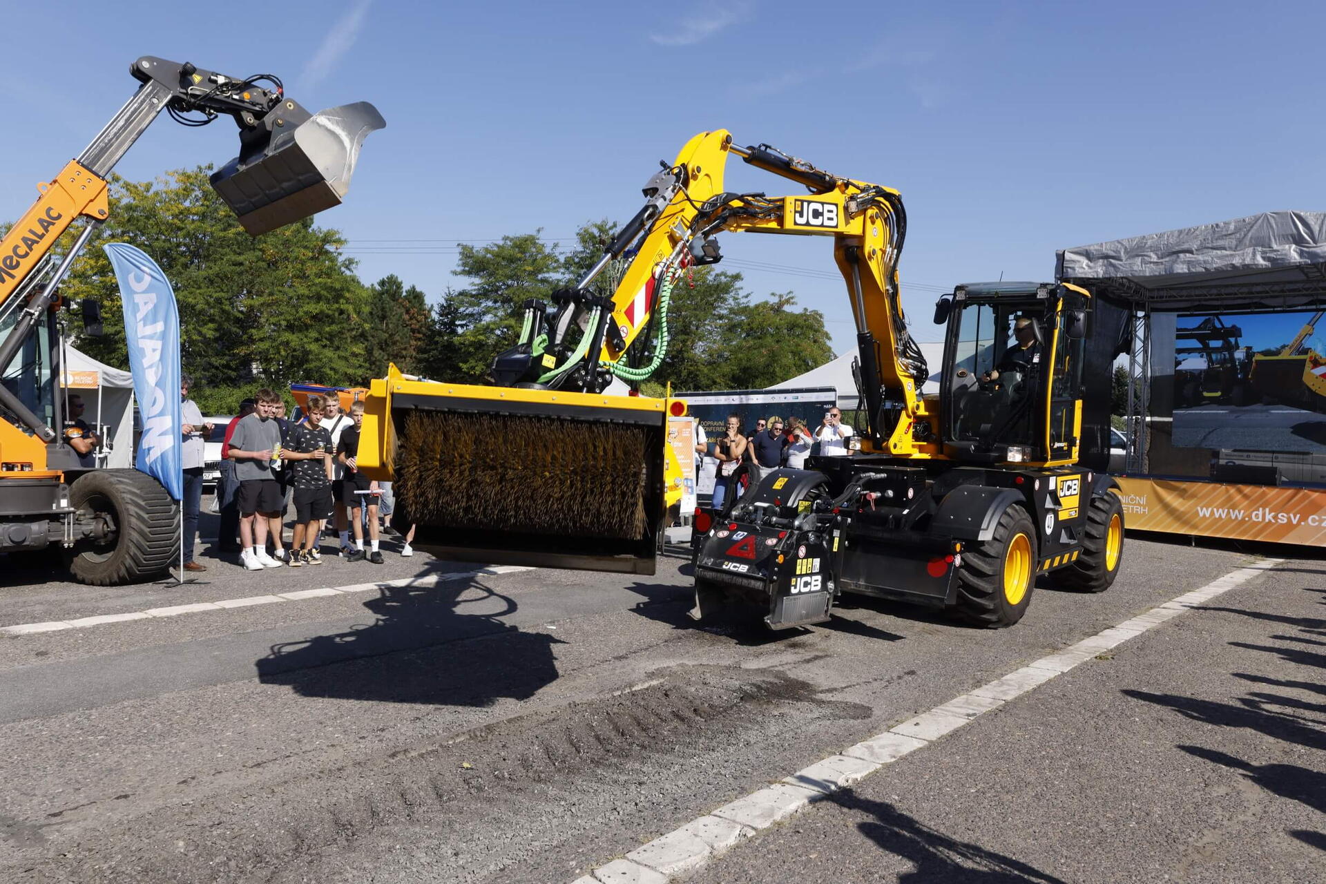 Rozhlížet se přitom, stejně jako ostatní návštěvníci veletrhu, mohl u letošních osmašedesáti stánků, mezi nimiž nechyběly ani v Pardubicích dosud neviděné novinky. Českou premiéru si na Silničním veletrhu odbyl třeba nový stroj Hydradig od JCB, který byl k vidění nejen u stánku, ale také v rámci praktické ukázky. Jedná se o zařízení obsluhované jedním člověkem, které je schopné si bez pomoci dalších strojů připravit povrch vozovky, vyfrézovat ho a vyčistit, aby bylo možné následně už jen položit nový povrch.