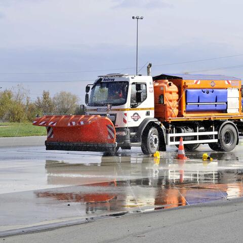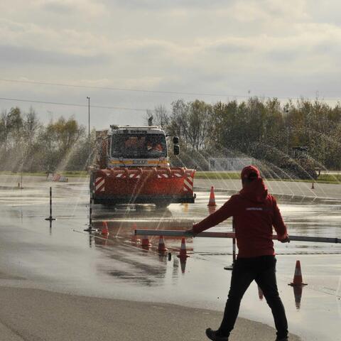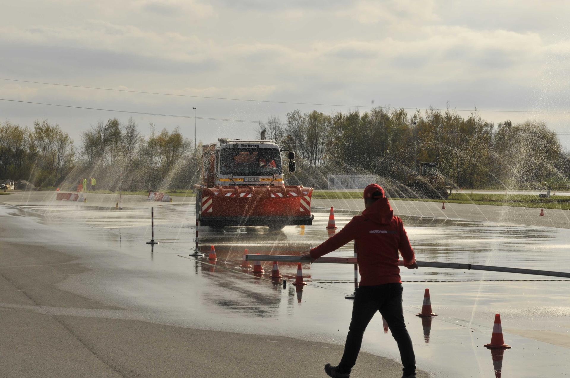 Jestliže se řidiči sypačů v běžné praxi s navlékáním kroužků na radlici nebo jízdou s tenisákem nesetkají, disciplína třetí přece jenom reálný život cestářských řidičů připomínala. Prověřovala totiž brždění vozidla na kluzkém povrchu.